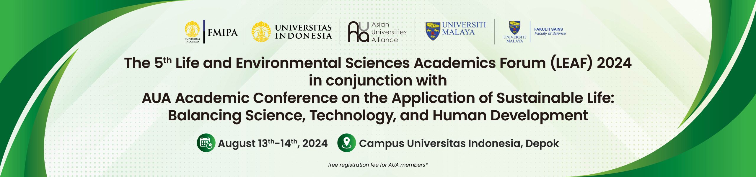 It is a great honor for us to welcome you to The 5th Life and Environmental Sciences Academics Forum (LEAF) 2024 in conjunction with AUA Academic Conference on the Application of Sustainable Life: Balancing Science, Technology, and Human Development. With the success of the previous conference, the Faculty of Mathematics and Natural Sciences, Universitas Indonesia (FMIPA UI) proudly presents this year’s LEAF conference series.