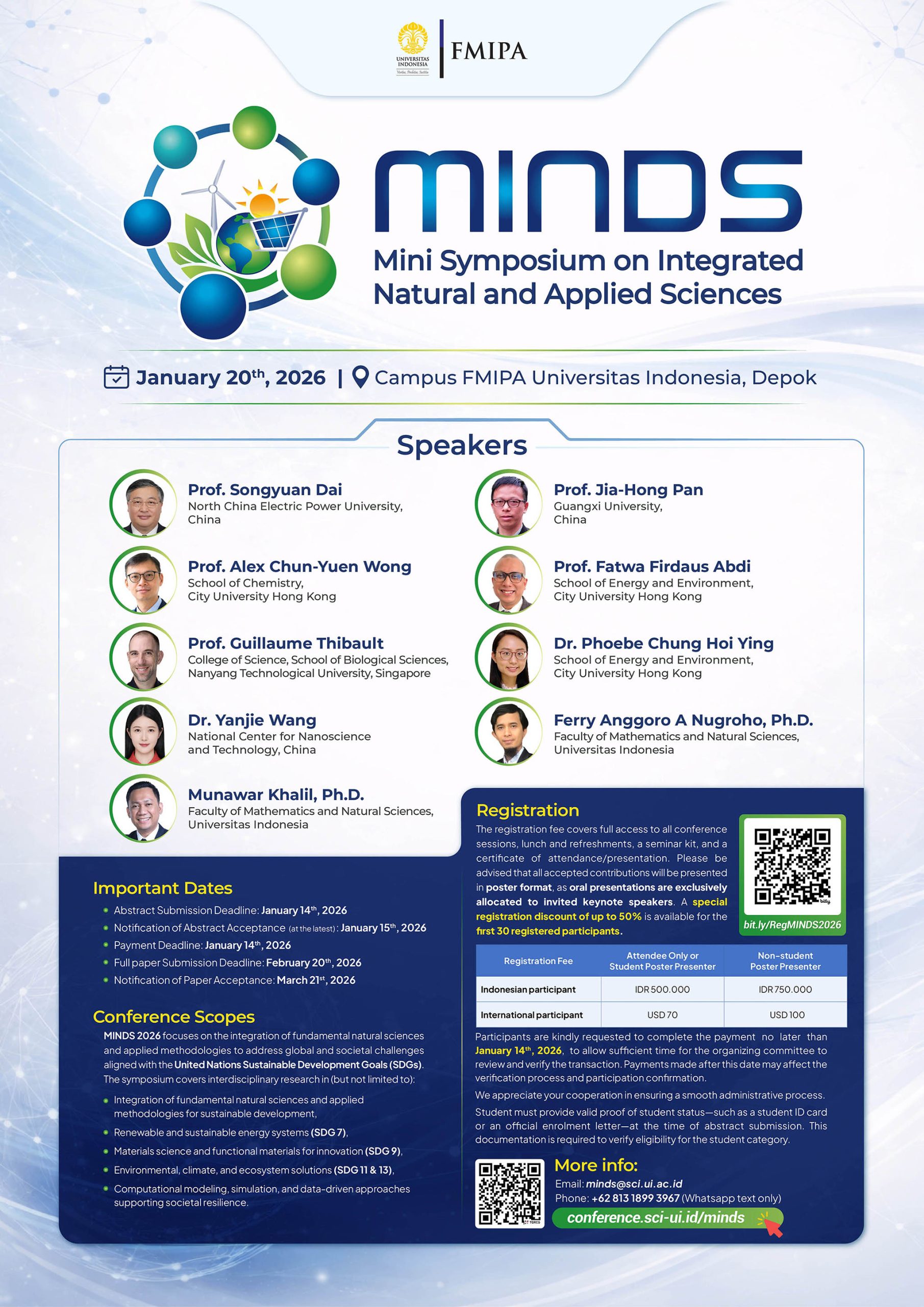The Mini Symposium on Integrated Natural and Applied Sciences (MINDS) 2026 is an academic forum organized by the Faculty of Mathematics and Natural Sciences, Universitas Indonesia (FMIPA UI). The symposium will be held on January 20th, 2026, at Campus FMIPA Universitas Indonesia, Depok, bringing together researchers, academics, and students to share and discuss recent advances in integrated natural and applied sciences.